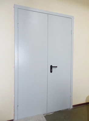 - Глухие двупольные огнестойкие двери состоят из коробки, двух полотен, внутренних наполнителей, деталей фурнитуры. Размеры зависят от места монтажа. Чаще всего их устанавливают на запасном эвакуационном входе, лестничной клетке, лифте, тамбуре. Поэтому конструкция имеет нестандартные параметры.