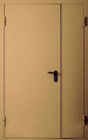 - Модель полуторной огнестойкой двери окрашенная по RAL 8000имеет две активные створки равных размеров, стандартный размер конструкции – 120 см в ширину и 200 см в высоту.