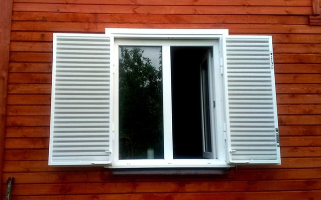 Двустворчатые ставни-жалюзи – востребованный вид защиты оконных проемов от грабителей. Кроме того, они хорошо пропускают свет, а регулируемые ламели позволяют регулировать его интенсивность.